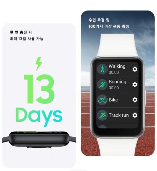 - 배터리: 208mAh, 한번 충전으로 최대 13일 사용 가능, 30분 만에 최대 65% 충전, C타입 충전